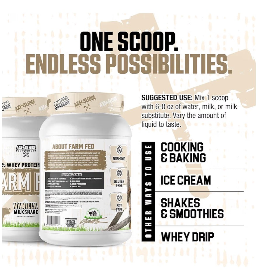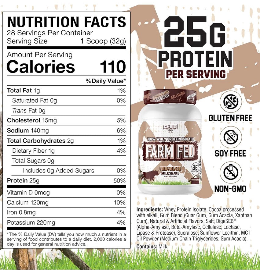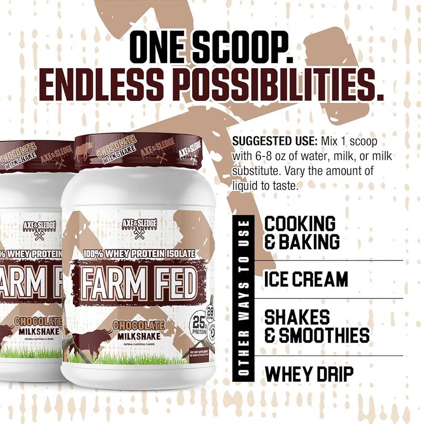 Fuel your gains with Axe & Sledge Farm Fed 100% Whey Protein Isolate – Chocolate Milkshake — a premium-grade protein powder engineered for athletes, fitness enthusiasts, and anyone committed to serious results. Crafted with only the highest-quality ingredients and designed for performance, this isn’t your average protein shake — it’s clean, fast-digesting muscle fuel that helps you train harder and recover quicker.