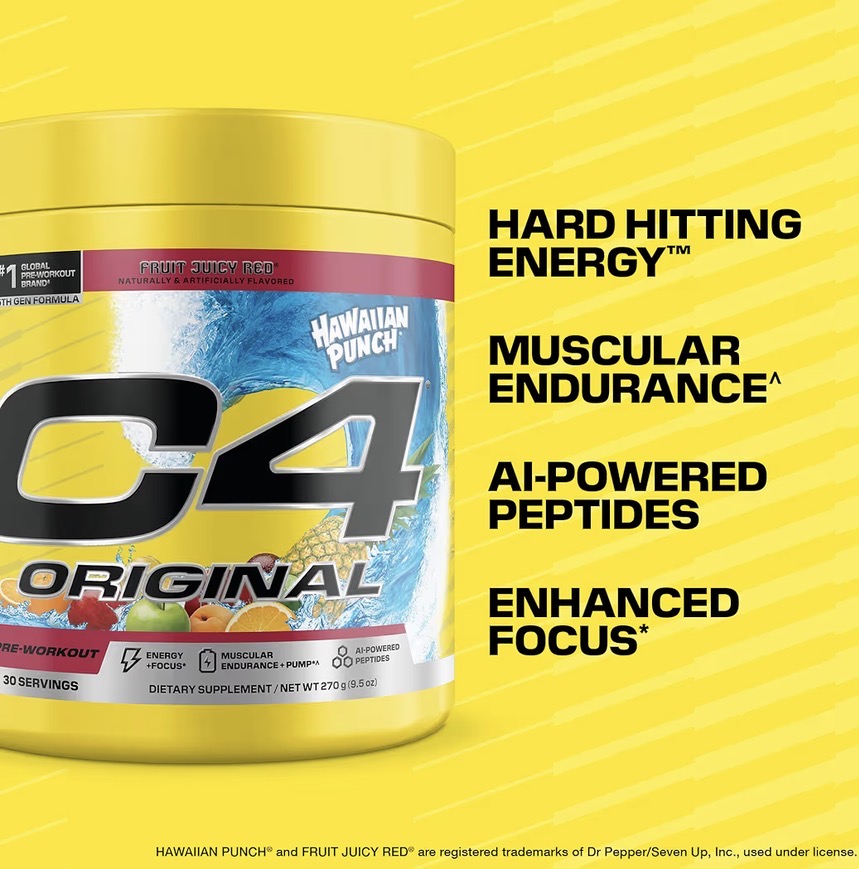 C-4 Original Pre Workout Fruit Punch delivers a powerful energy boost before your workout, whether you're training at the gym, at home, or engaging in endurance sports like cycling. Its effective formula helps enhance focus and stamina, ensuring you perform at your best every session. With 30 servings, it’s the perfect companion to fuel your fitness goals and push your limits.